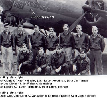 We formed our crew at Moses Lake, Washington. We trained together as a crew in the U.S.A. prior to flying our B-17 to England. We Joined the 100th Bomb Group in England on October 13, 1943. We were assigned Airplane B-17 Model F. # 413 The name of this airplane was "Hard Luck".. We flew this B-17 until given a new model B-17 G. We called this one"Hard Luck 2" Crew members at the time of our first combat flight, were the original from Moses Lake Washington. Except our co-pilot Jack Ogg who joined the crew at the 100th base, replacing our original Co-pilot Bertrand McNeil.